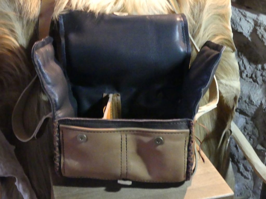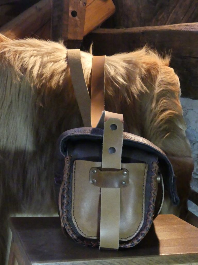 Sangle en croupon de cuir bovin passe sous l’ouvrage afin de maintenir le sac malgré le poids de l’ordinateur et des classeurs.