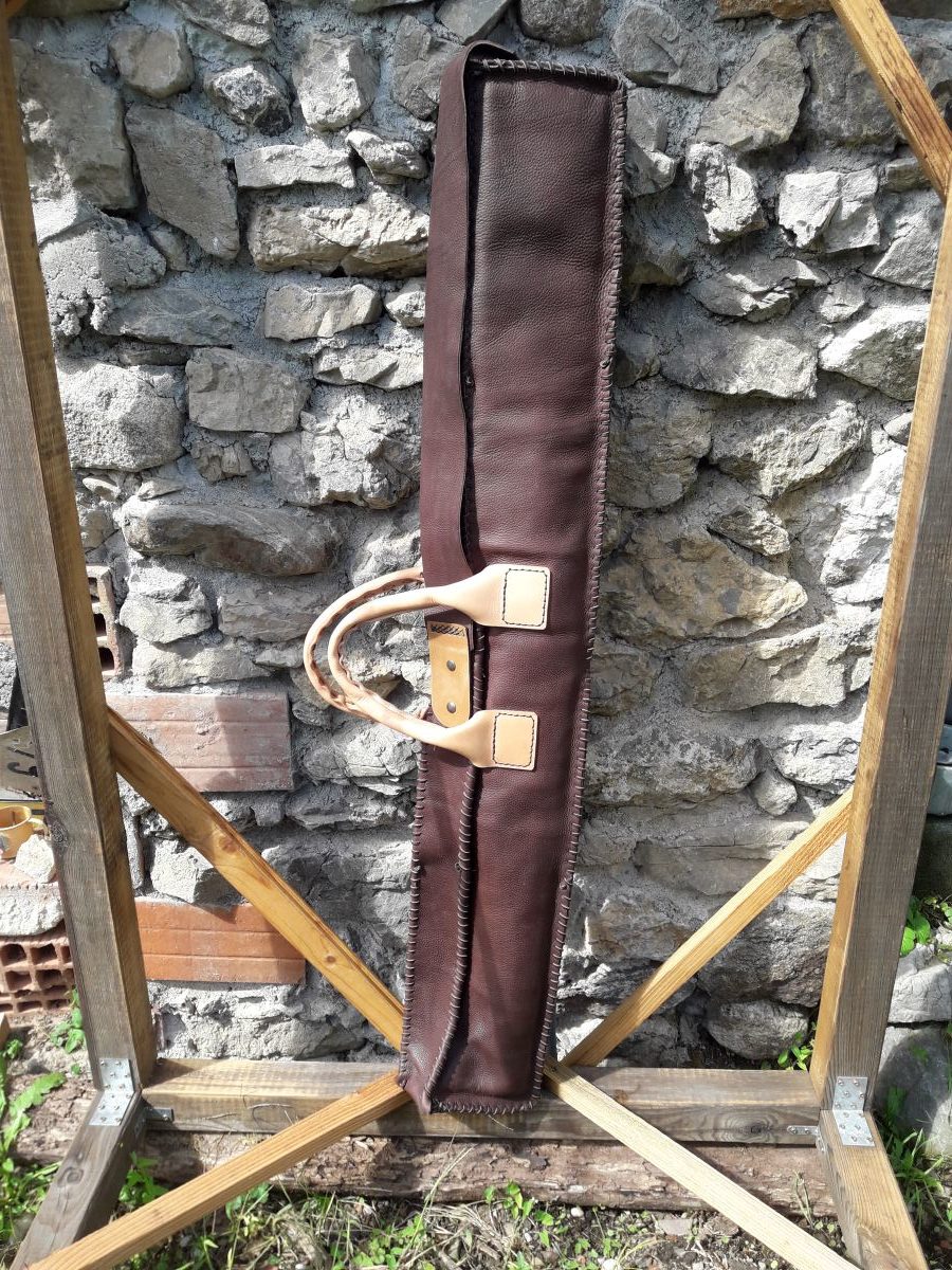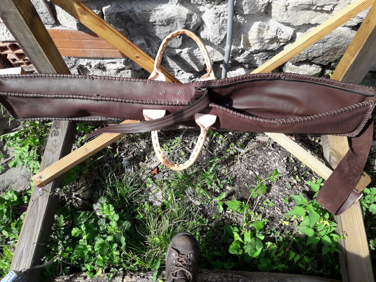 Housse réalisée sur commande pour quelqu’une qui n’est jamais passée ne serait-ce que voir le résultat…. Tout en cuir pleine fleur, lacée main, capitonnée au feutre afin de protéger l’arc. Double zip pour manipulation optimale et recouvert d’une bande fixée au centre par pression. Double anse pour en cuir bovin naturel tanné végétal pour une patine naturelle et au fil du temps. Se porte à la main ou sur l’épaule. Prévue pour un arc de compétition d’1.33m