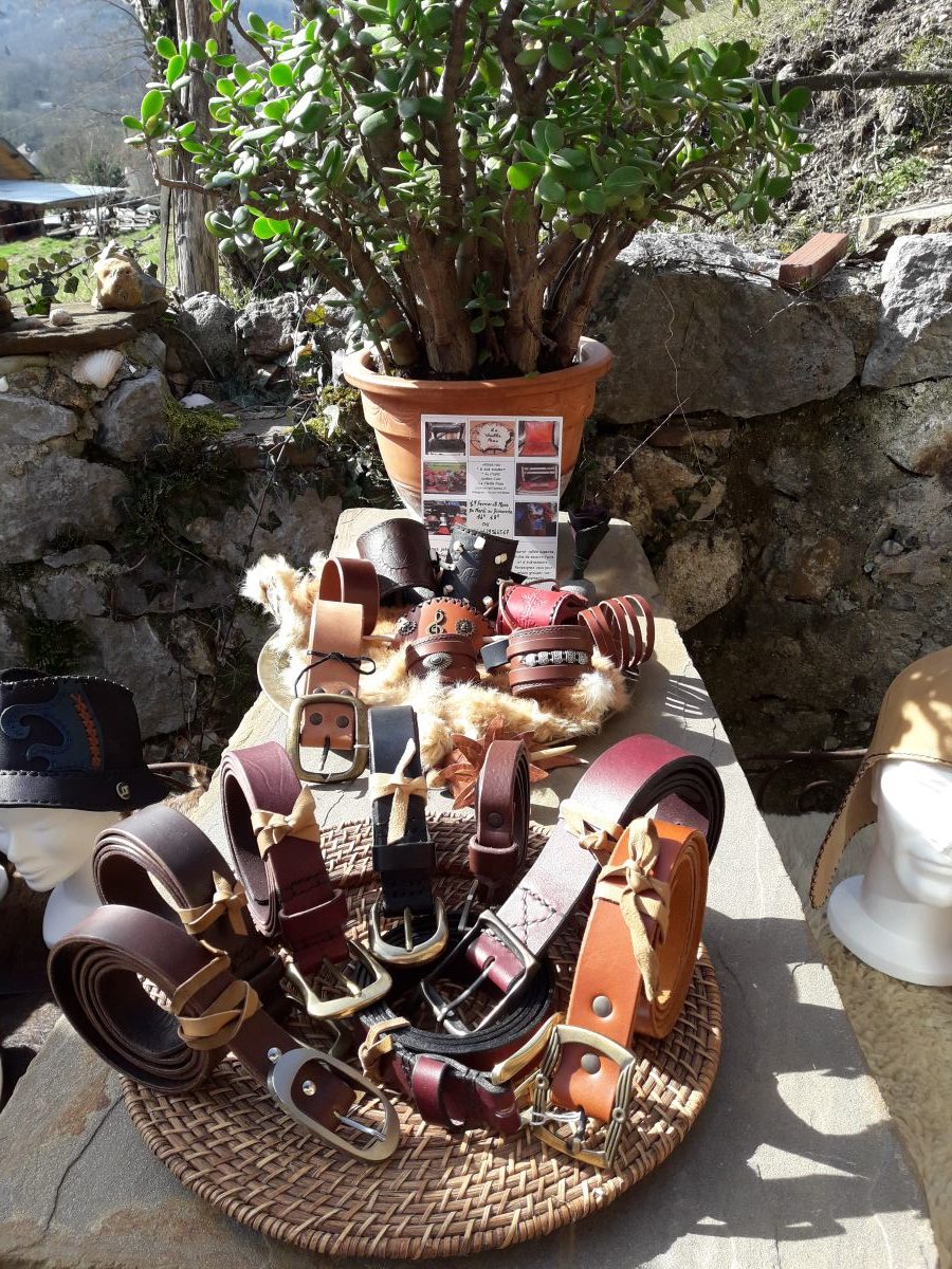 Panel de ceintures en cuir, différentes boucles, rivetées ou cousues main….