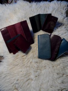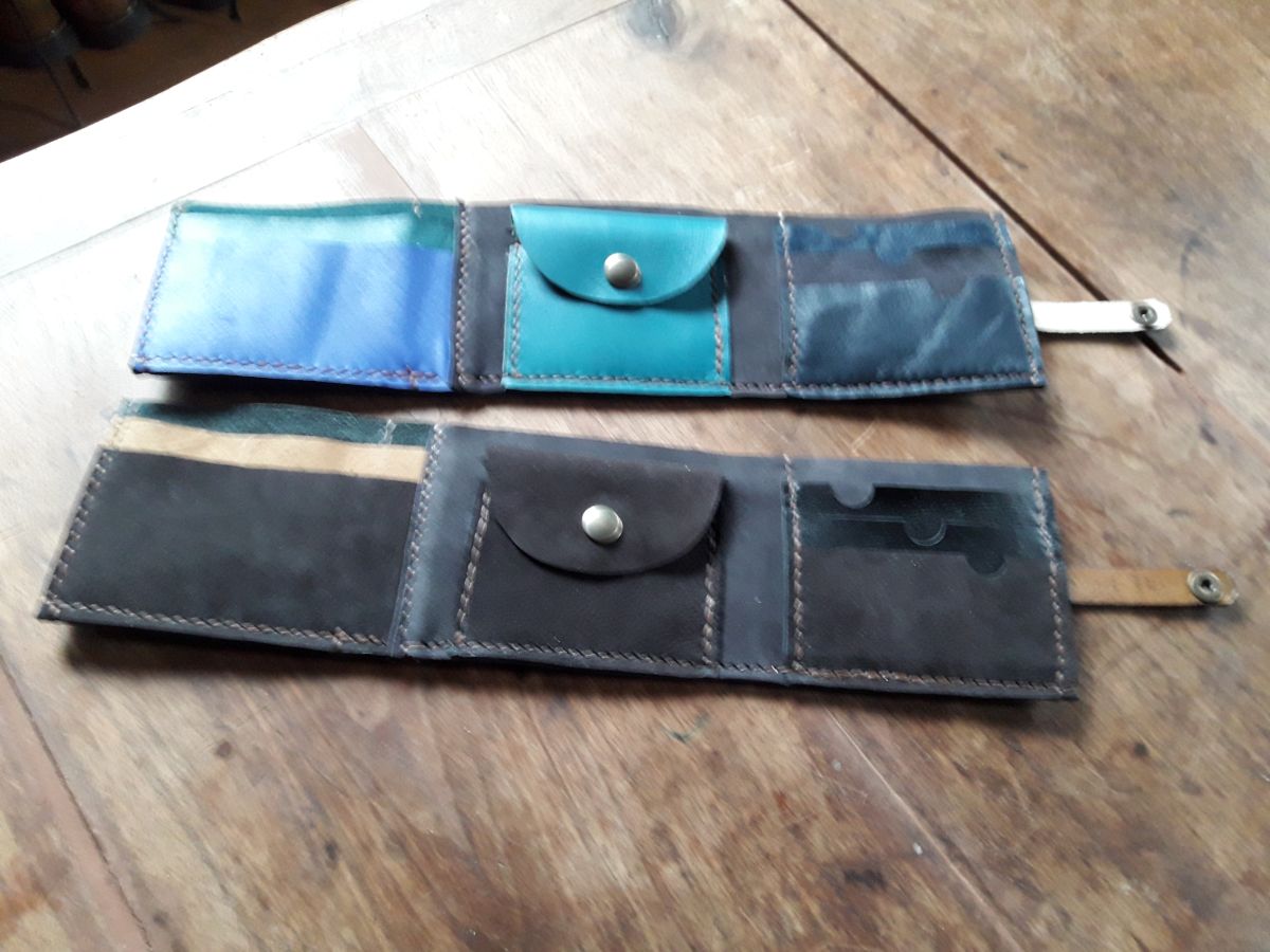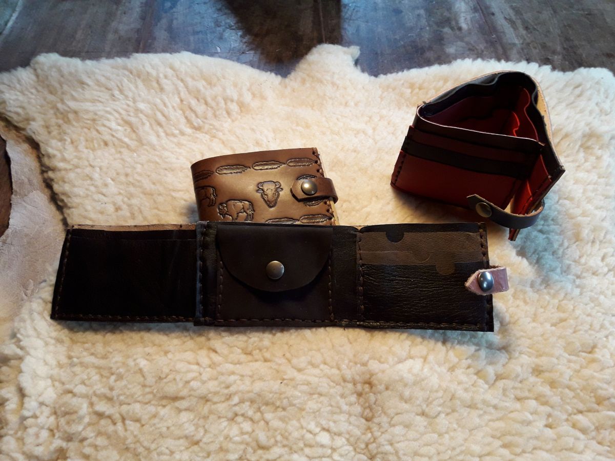 Portefeuilles en bovin naturel teints et cousus main. Rangement monnaie, 6cb, 2 id.